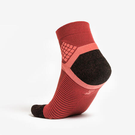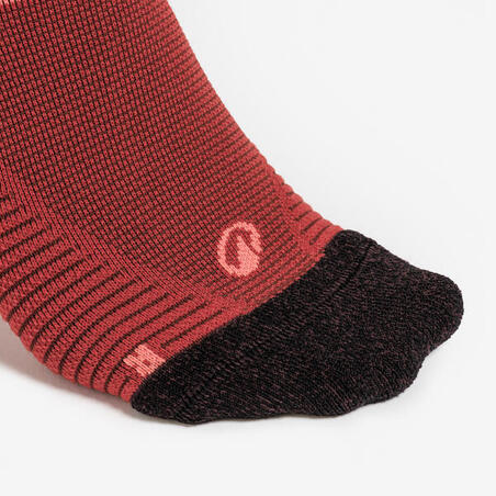 Для пятки и носка мы выбрали техничную пряжу со специальным покрытием (ПТФЭ), которое снижает трение и, следовательно, риск появления волдырей. Однако эти носки не могут обеспечить 100% защиту от образования мозолей. Мозоли на стопе появляются вследствие длительного трения кожи о складки и материал носков, а также из-за неудобной колодки ботинок или попадания посторонних предметов в обувь. Влажность также способствует этому.